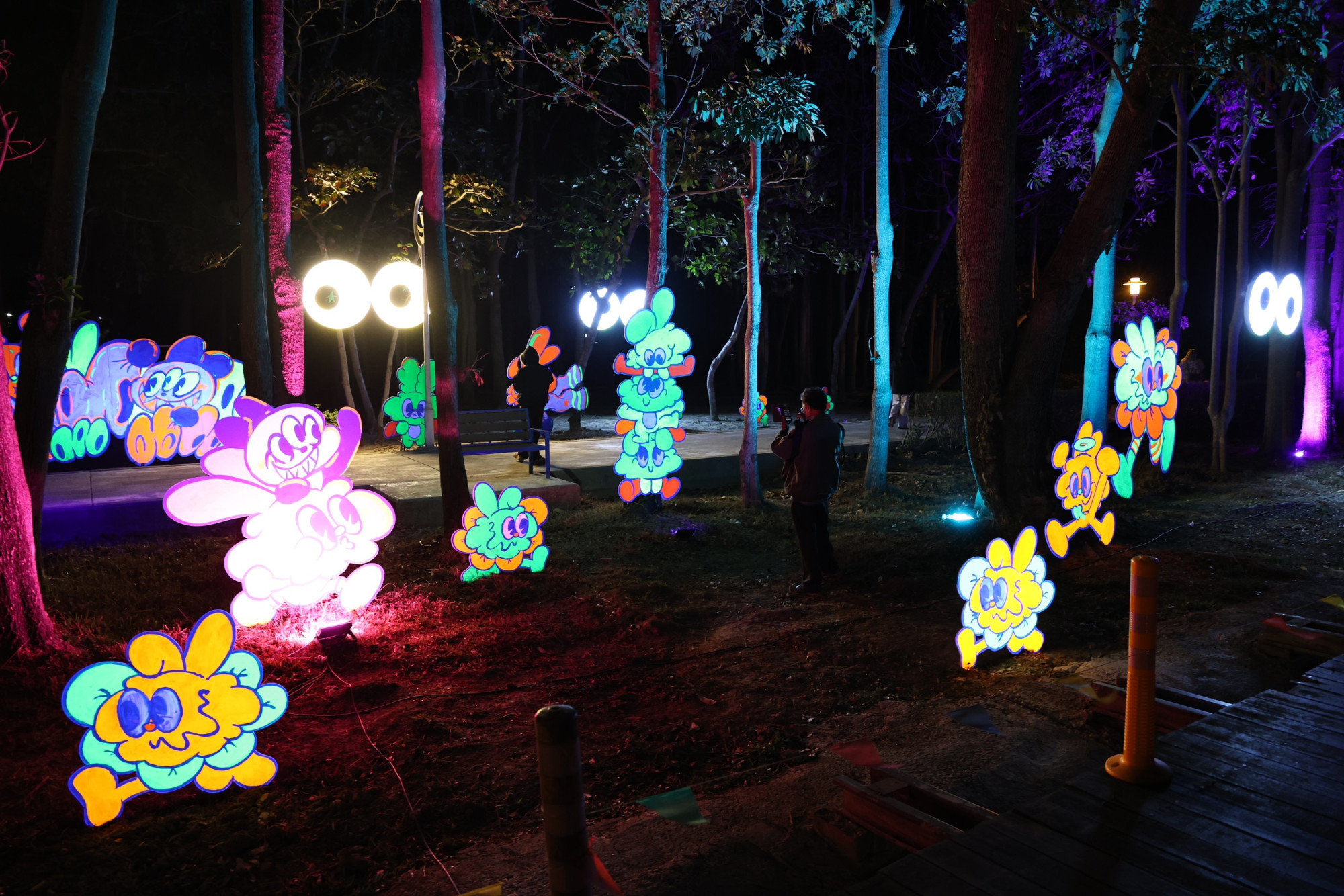 國際團隊SPLACES.STUDIO帶來的聲音互動作品《Nidium》,以鳥巢意象收錄環境聲響並即時轉化為光影變化;黑川互動媒體藝術的《共生島》運用水霧投影與肢體感應,邀請民眾與動畫共舞;凡京設計《時空之序》則以迴圈式光門營造夢幻儀式感。新銳團隊「無邊製造」與「雜波ZAP」分別推出《橋上相遇的光》及《彼此之間的漣漪》,將身體動作轉化為流動光影;藝術家「緩緩」與「蓓蓓」也將筆下角色具象化,呈現《夜晚夢遊慶典》與《湖光聽風:與鼠尼共度悠閒》,邀請民眾在夜色中放慢腳步,走進一段療癒而奇幻的探索旅程。