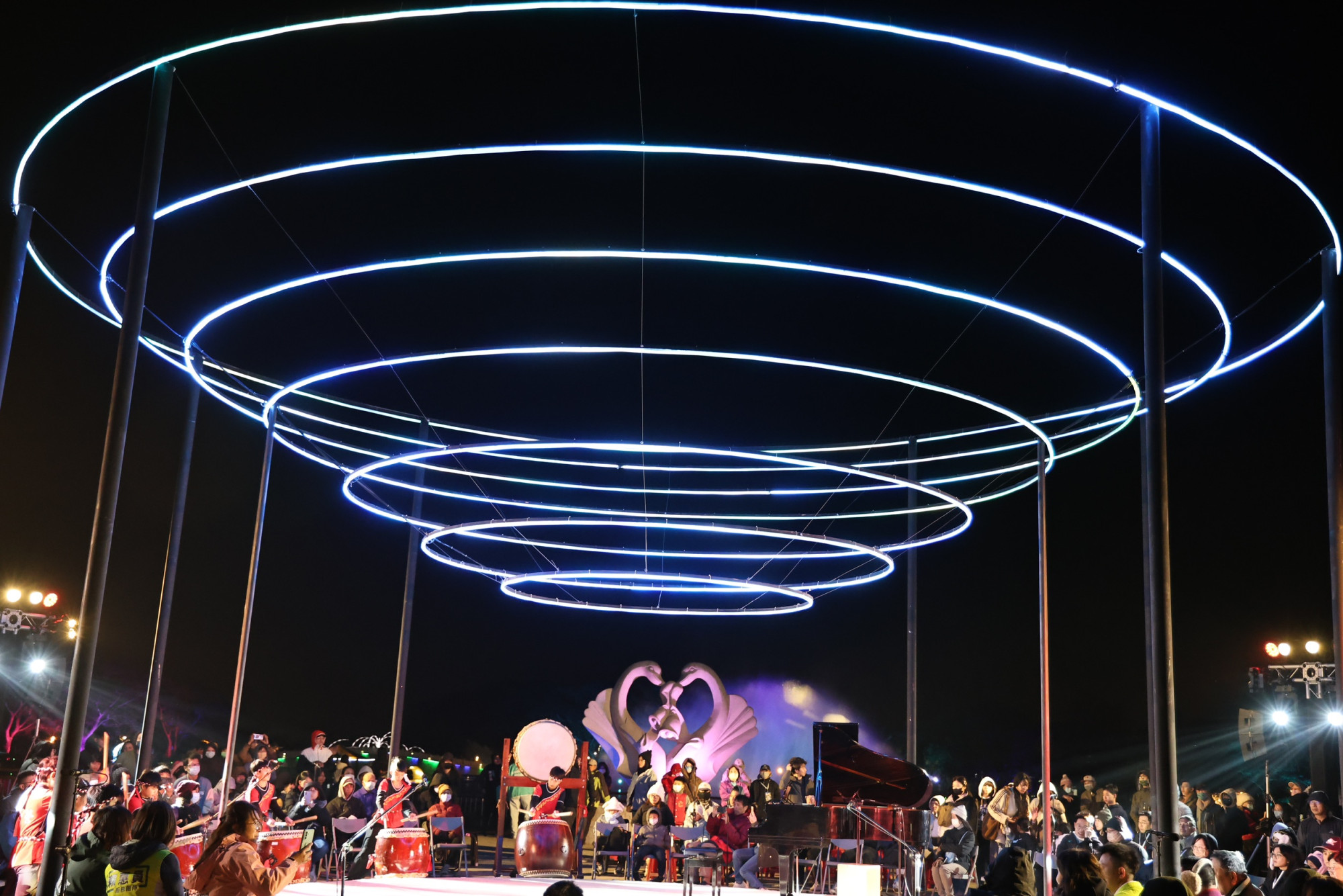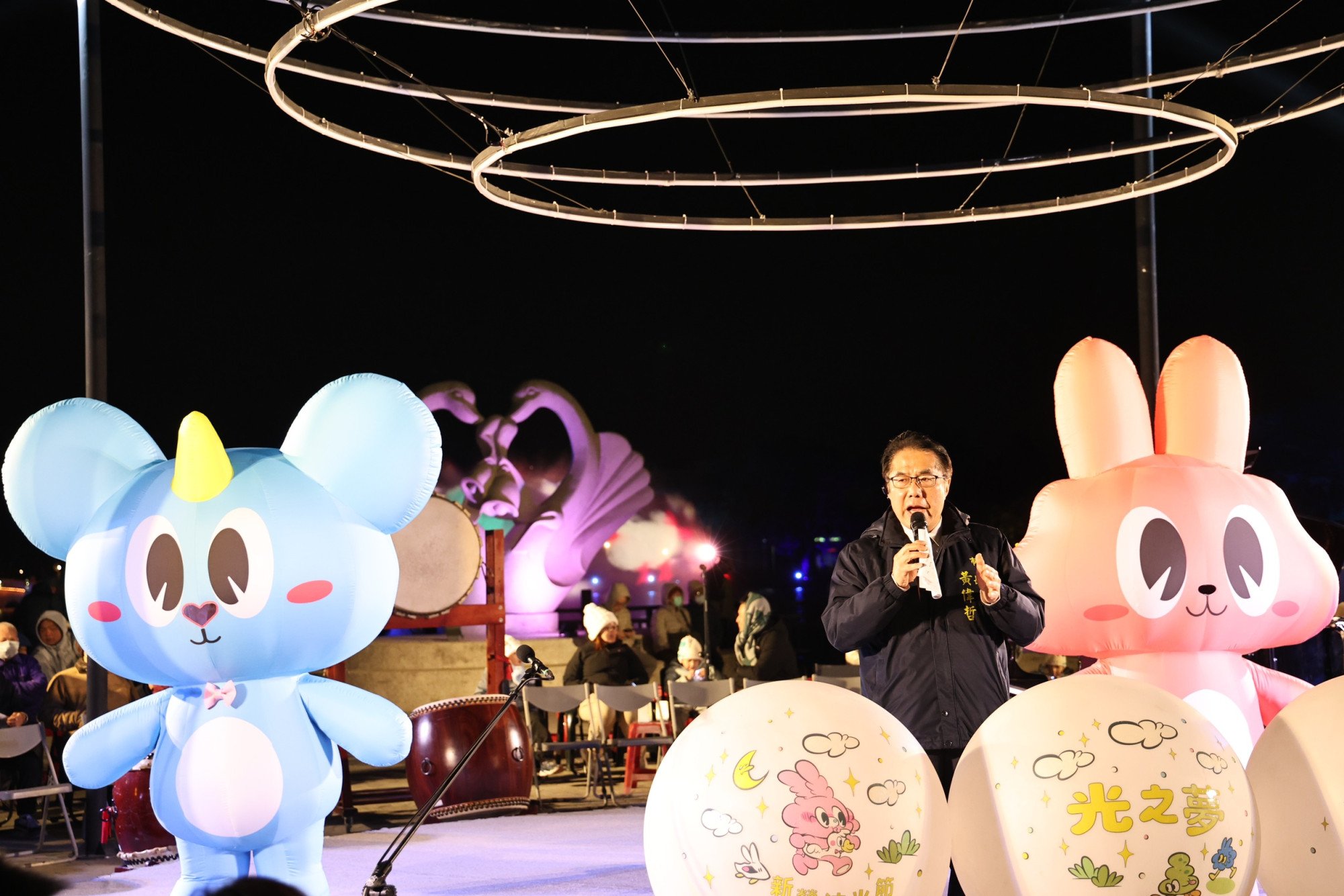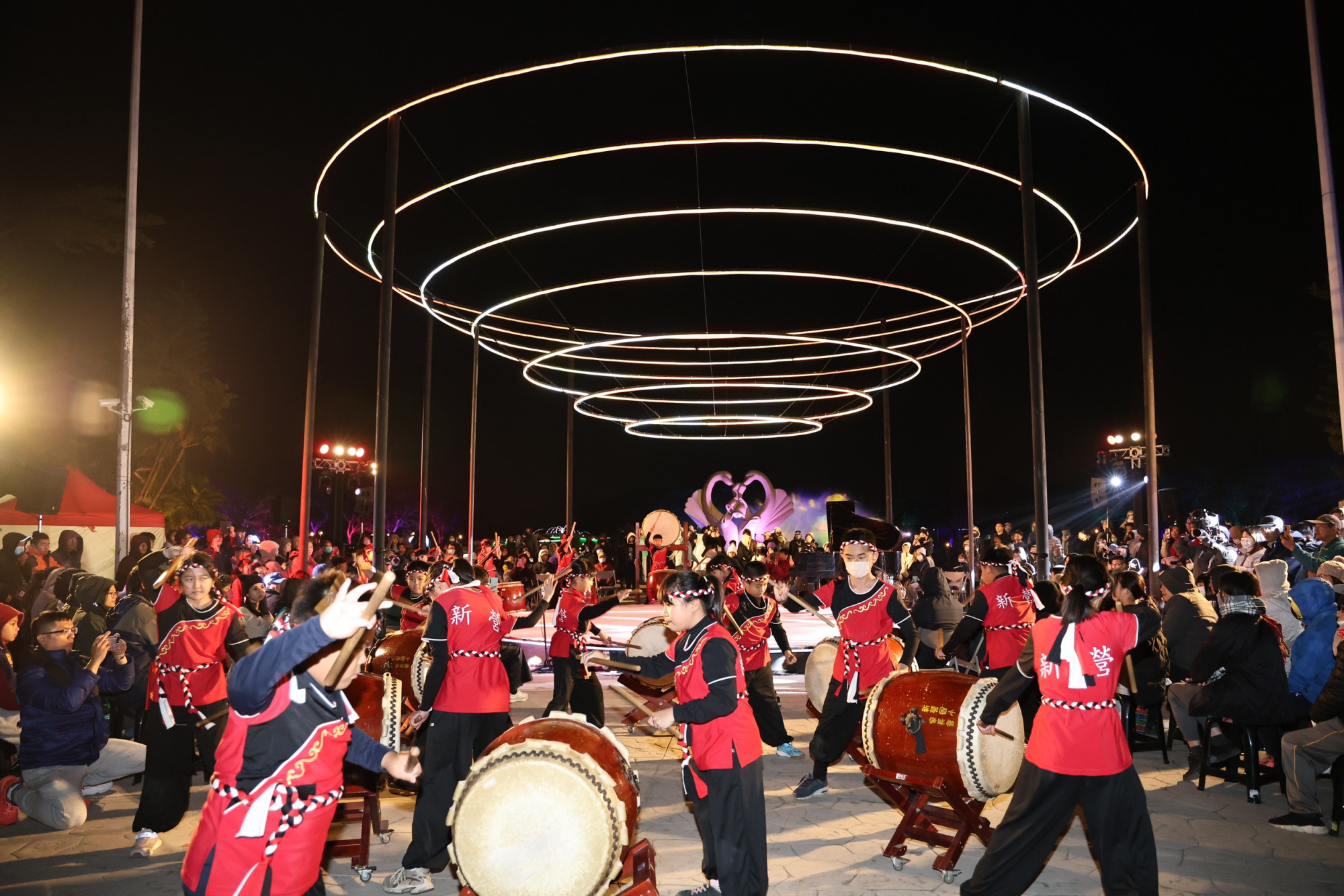 今晚開幕儀式由市長黃偉哲偕同貴賓於特別打造的作品《時空之序》舞台上共同啟燈揭幕。開幕展演由新營國小太鼓隊熱鬧開場,接續安排吳昱霆鋼琴獨奏與右武衛合唱團演出,壓軸登場的「Xinying to Singing—新營開唱」共演計畫,打破傳統舞台形式,由在地表演團隊攜手事前募集、共同排練的市民朋友同台獻唱,展現新營最動人的在地能量,也為城市留下溫暖而深刻的節慶記憶。