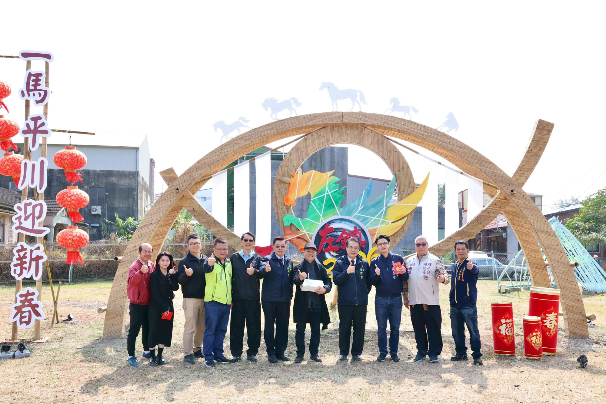市長黃偉哲與貴賓、在地藝術家於左鎮蔗埕公園主視覺竹藝裝置前合影,為「2026左鎮燈會」揭開序幕,展現以低成本創造高效益的社區共創成果。