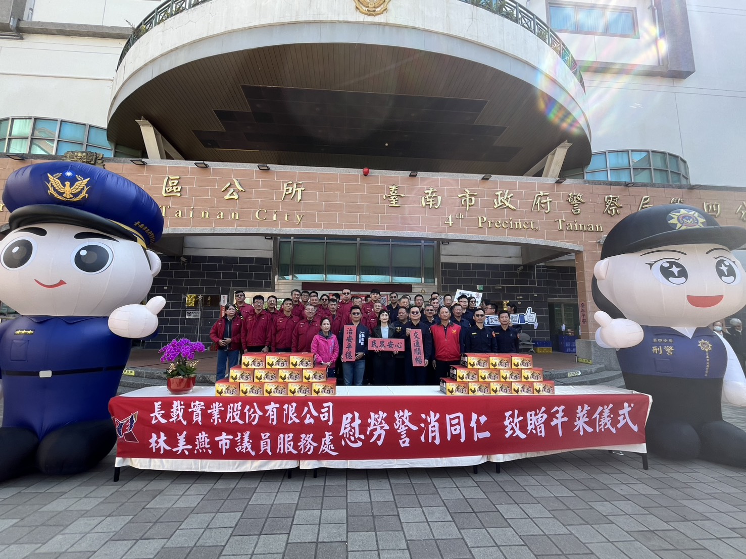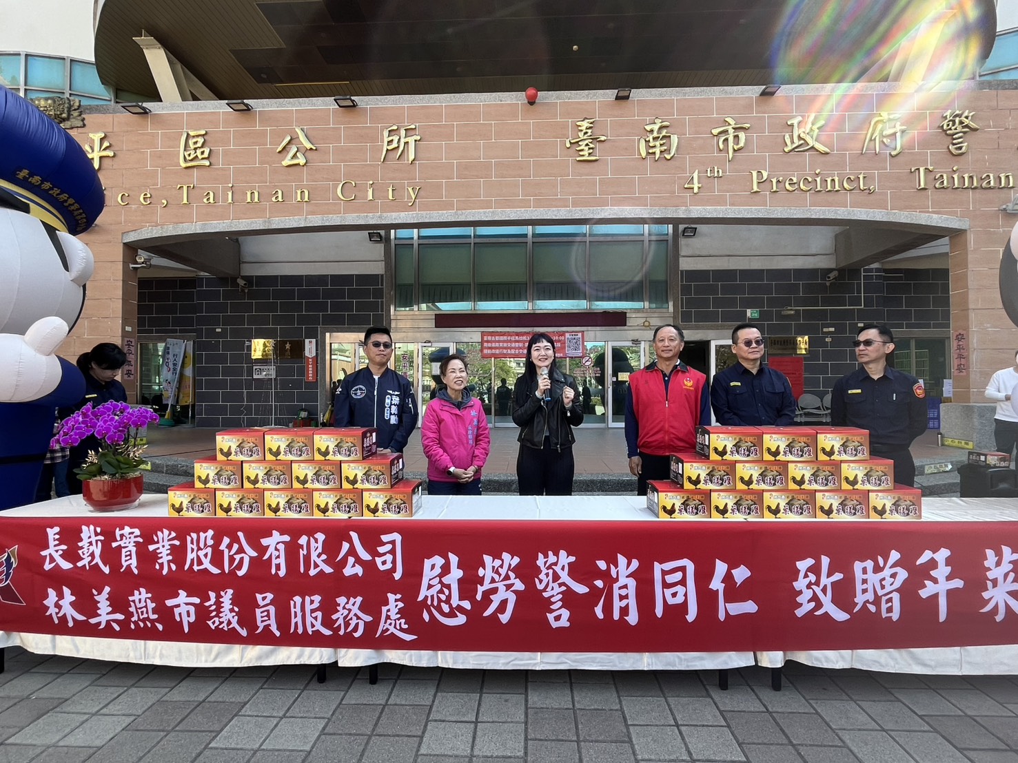 【記者田進山/台南報導】許多警察、消防人員在年節仍需輪班值勤,台南市議員林美燕持續11年結合商界人士,捐贈年菜,讓警消夥伴仍可在崗位上享受過節的歡樂氣氛,今年由長裁實業股份有限公司贊助4百餘份,12日在警四分局舉行公開捐贈儀式,各受贈單位都欣喜表示,警消同仁感受到社會各界的愛心,更能在春節期間專心守護民眾的公共安全。