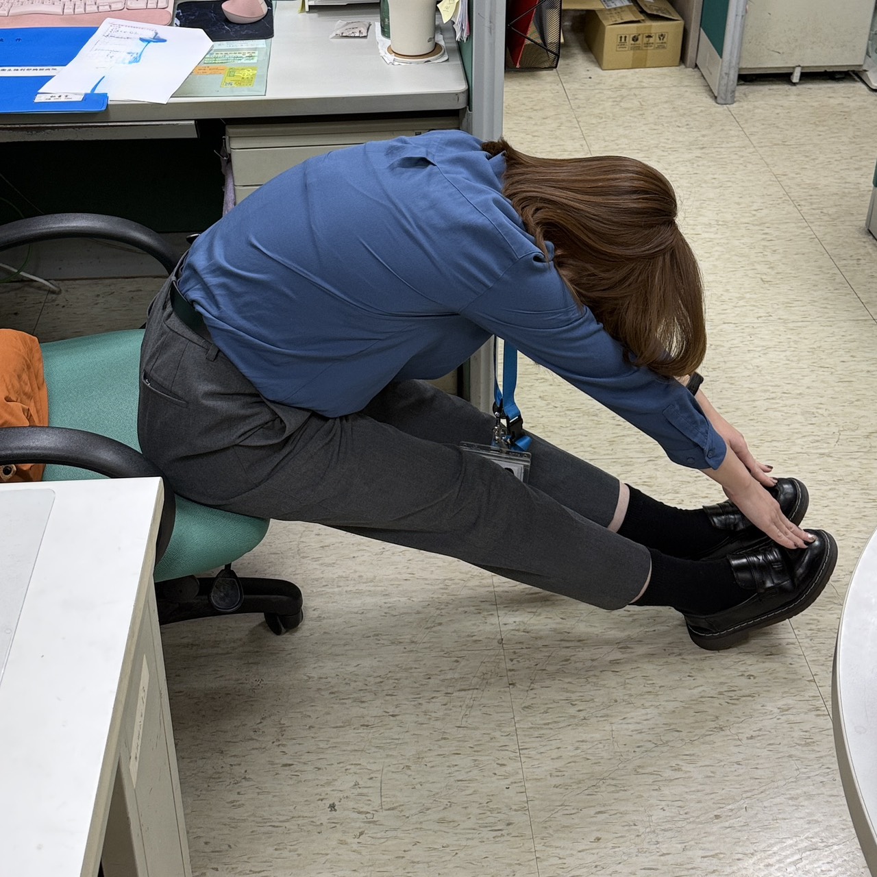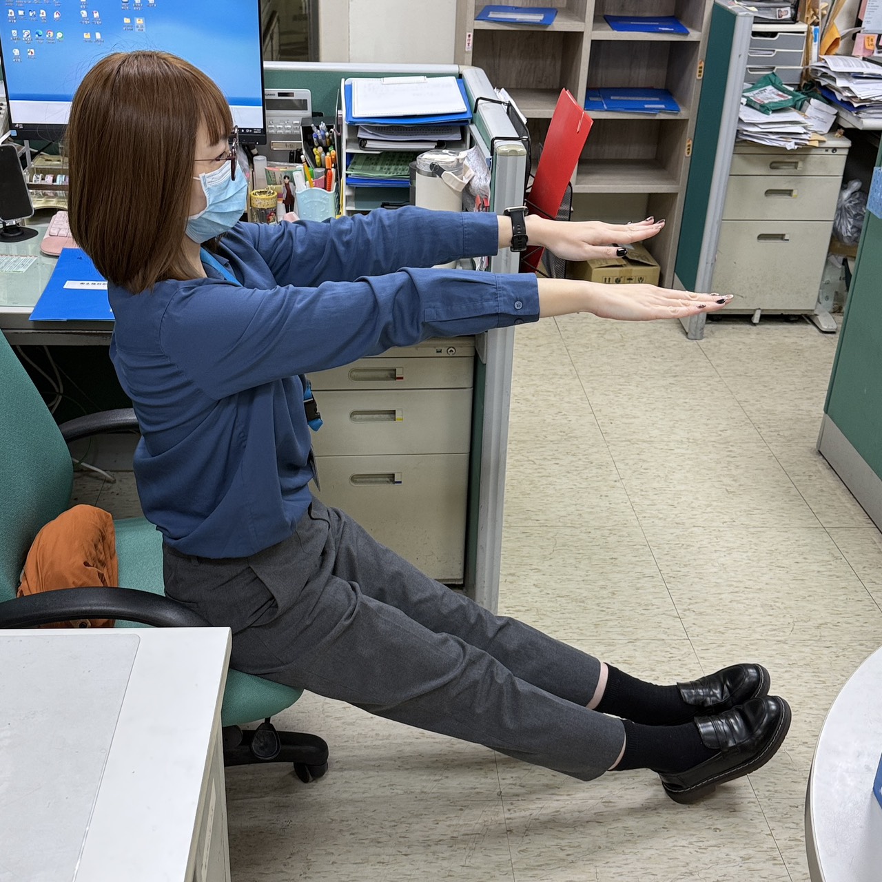 1.坐姿下將膝蓋伸直、腳跟著地