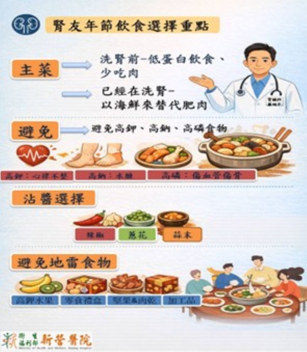 【記者田進山/台南報導】馬上要過年囉!春節期間豐盛的年菜跟零食,讓人食指大動、難以抗拒。部立新營醫院腎臟科羅翊中醫師提醒腎友,如果疏忽細節、放縱飲食,可能會因為腎功能不佳,無法排出而累積在體內,引發健康問題,壞了年節好興致,所以一定要注意以下幾項飲食重點: