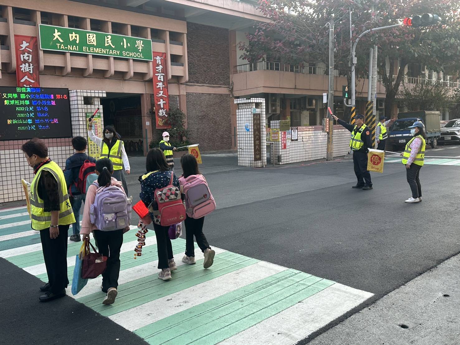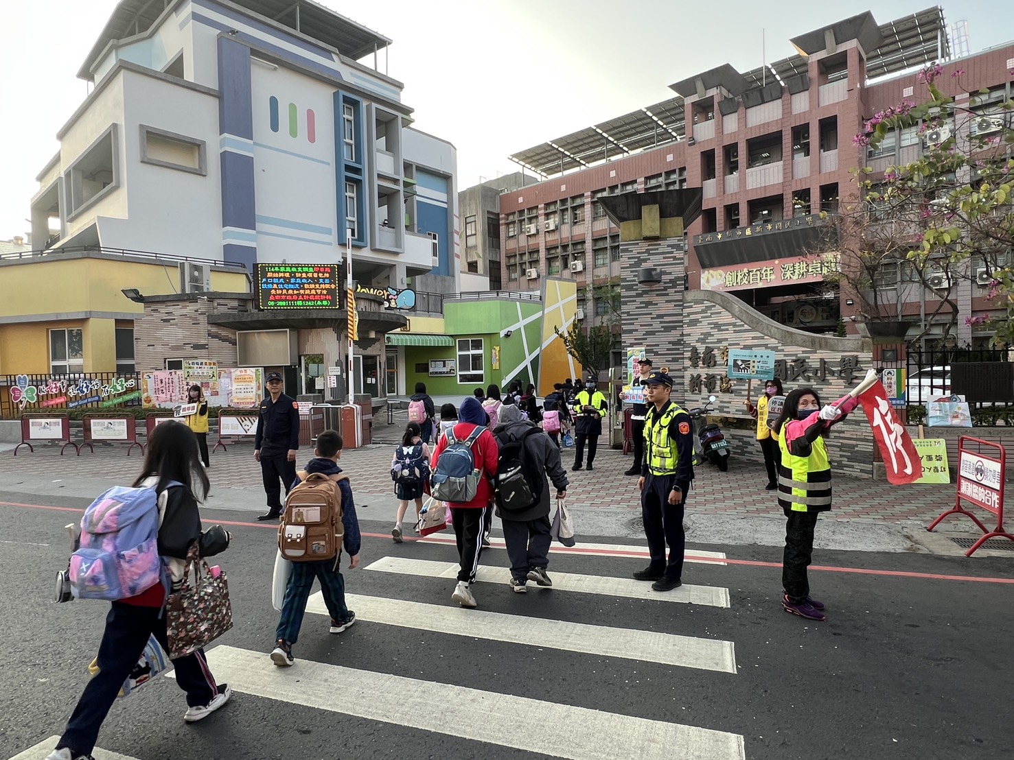 【記者田進山/台南報導】2月23日為南市各國小開學日,善化警分局為避免校門口交通壅塞,影響學童上學用路安全,特於轄內善化、安定、新市、大內等4區,計15所國小,在校門口編排勤務維護秩序,並於學校周邊重要路段、大型路口執行交通疏導,守護學童安全。