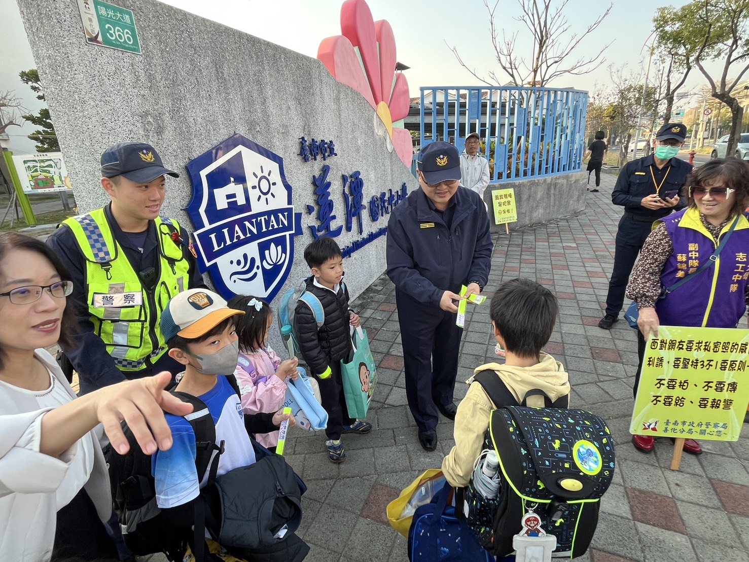 開學首日,善化警分局針對轄區內學童上學時段,配合校方派遣警力執行「護童勤務」,在有限的警力下,結合義交、義警、志工共同執行,加強維護學童上學的安全。除將警力規劃在最明顯的位置,針對學校附近周遭可能危害學童安全危險因子,如落單學童提供適時導引、加強側門無導護老師、志工之協助,以貫徹守護學童安全的決心,務期讓每一位家長對於幼童上學均能安心。執行護童勤務的同時,一併宣導婦幼、交通安全與防詐:傳達正確觀念,提升學童「自我安全保護觀念」,還有「保護自己身體自主權,任何人(包括熟人、親戚)都不得隨便觸摸」、「兒少性私密影像:『不拍攝』、『不持有』、『不上傳』」等正確安全觀念,並提醒學童過馬路時應遵守交通號誌,不可違規穿越道路,切勿嬉戲打鬧或低頭使用手機,並同時宣導腳踏車用路、禮讓行人規定及宣導常見詐騙手法並教導防詐小訣竅,倘接獲疑似詐騙訊息,不要慌張,牢記「1聽」、「2掛」、「3查證」口訣,或查詢「打詐儀表板」、撥打「165反詐騙專線」,並要記住報案電話110。