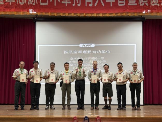 臺南市童軍會表示,今年除辦理思源儀典外,亦同步舉行木章持有人年會,以凝聚童軍幹部向心力。本次共頒發木章27名,象徵完成木章訓練的重要里程碑;另頒發銅獅、銀牛、銀狼、銀羊等各級工作獎章共27位。工作獎章係童軍總會依各縣市年度推動童軍活動成果綜合評比而來,展現全體服務員長期努力的具體成效;此外,頒發團領導人青松、翠竹、臘梅等績優獎章45位,表彰在童軍領導與推動工作上表現卓越的伙伴。同時,表揚億載國小漁光分校、南科實中、三慈國小、臺南海事等11個推展童軍運動有功單位,肯定其積極辦理各項童軍活動與訓練,持續提升整體童軍教育品質。