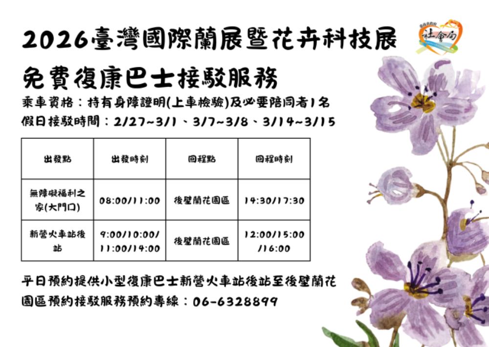 社會局長郭乃文表示,市府持續打造友善無礙城市,透過交通接駁與貼心服務,讓每位市民都能平等參與城市盛會,共同感受「2026臺灣國際蘭展」的花藝魅力與城市溫度。平日小型復康巴士亦提供新營火車站後站至後壁蘭花園區來回之免費定點接駁,預約專線:06-6328899。