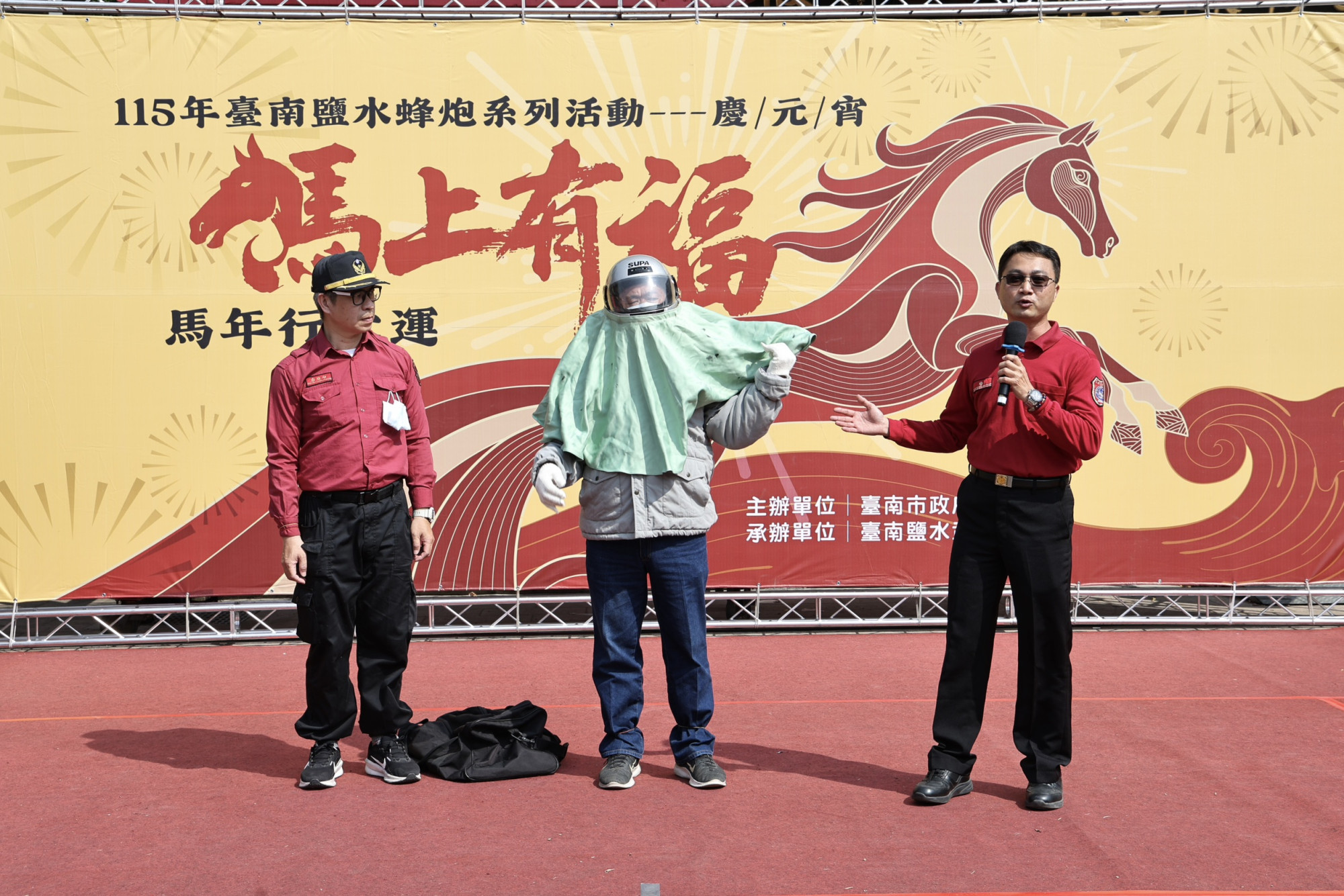 台南市政府強調,參與蜂炮體驗要能玩得盡興,安全是最重要的考量,今日記者會特別安排消防局專業人員現場示範參加蜂炮活動的「完整防護穿著」。提醒有興趣參與蜂炮活動的民眾,整體服裝應以「非可燃性材質」為佳,包括可穿戴全罩式安全帽(保護頭部)、棉質毛巾(保護頸部)、口罩(保護呼吸道)、棉質或牛仔厚外套、棉質或牛仔厚長褲、棉質手套、棉質襪子、平底鞋或運動鞋等等,以防止受傷,期盼來體驗的民眾皆能夠開心參與、平安回家。
