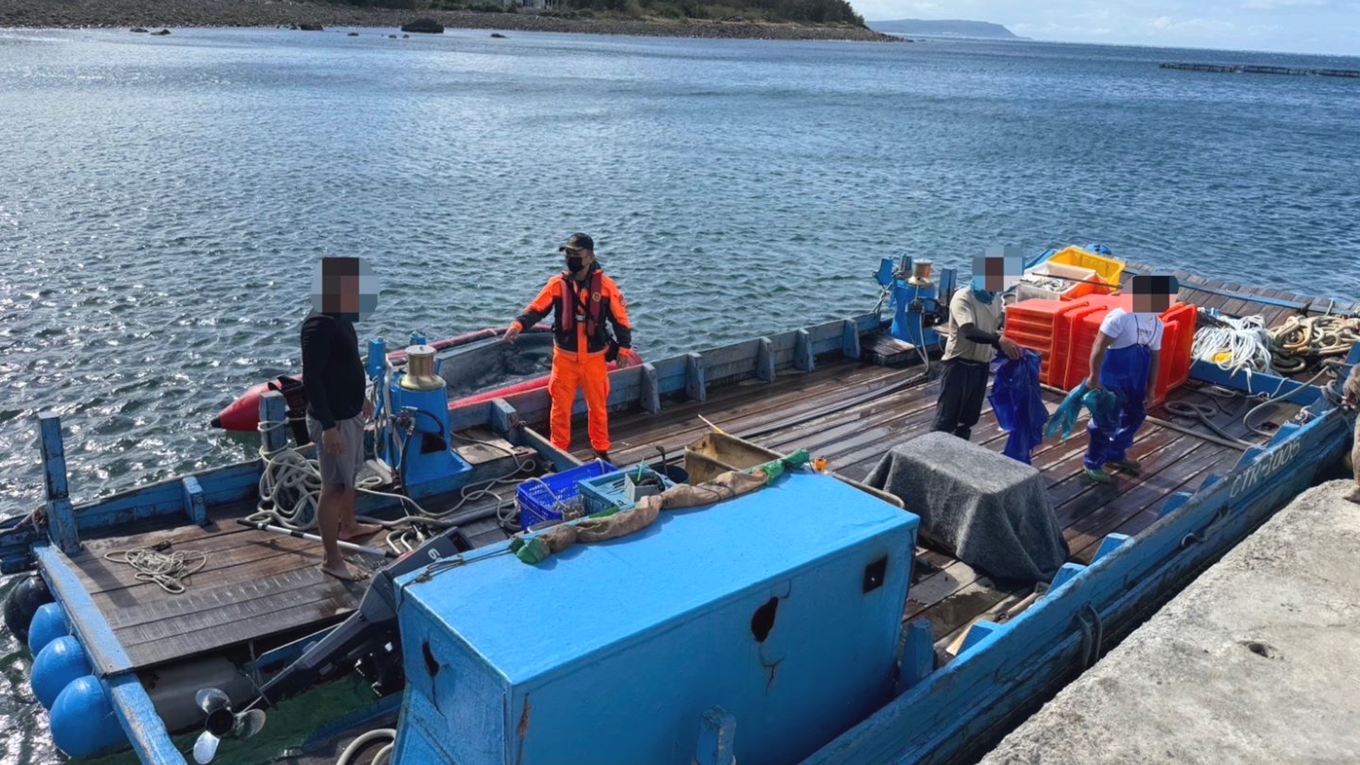 海口安檢所執勤同仁第一時間評估現場環境與可用資源,並在友好漁民協助下,搭乘膠筏迅速前往現場實施救援。經海巡同仁及漁民通力合作下,順利將該名落水男子救起,並安全接駁返回岸際。經初步檢視,該落水男性意識清楚、生命徵象穩定,後續自行離開。