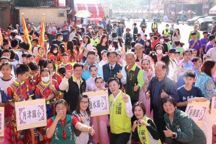 今日的開場演出由鹽水國中、歡雅國小與岸內國小3校跨校組成廣東獅團隊帶來「群獅嬉戲獻祥瑞