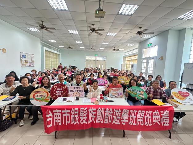 【記者田進山/台南報導】台南市社會局委託臺南市南瀛公教退休人員協會經營臺南市銀髮創齡服務中心,11日下午在麻豆區南勢里活動中心舉辦「麻豆銀髮學苑創齡遊學班」開班儀式,由社會局老人福利科鄭妙君科長、南瀛公教退休人員協會陳榮雄理事長、麻豆區楊政舉區長帶領77名銀髮學員一起歡心開嗓,為接下來的學習給予滿滿的支持與肯定,激發學習新動力。