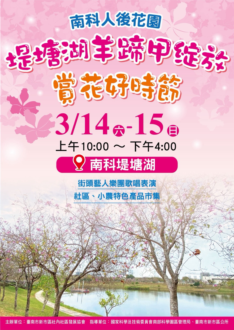【記者華民鳳/台南報導】隨著春意漸濃,南科迎來了年度最浪漫的視覺盛宴。位於南科臺南園區的「堤塘湖」,湖畔羊蹄甲正迎風綻放,將湖岸染成一片淡淡的粉紅色。為了邀請民眾共享這份春日美景, 115 年 3 月 14 日(週六)及 3 月 15 日(週日),連續兩天,由新市區社內社區發展協會舉辦「南科堤塘湖羊蹄甲綻放 賞花好時節」活動,邀大家邊賞花拍照打卡,邊逛市集。