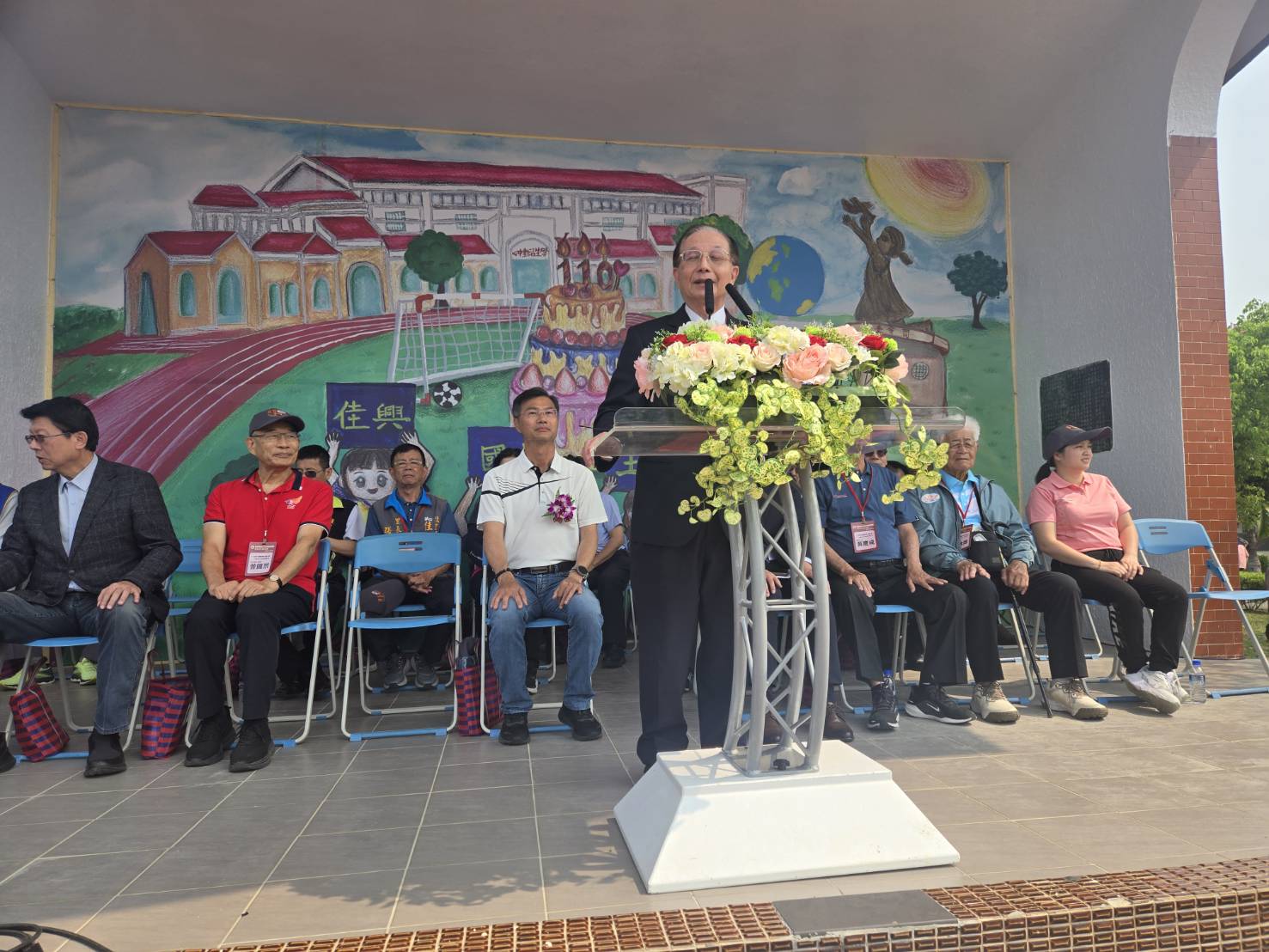 佳興國民小學校長 黃三河致詞感謝本次110週年擴大校慶籌備委員會主任委員前教育部長吳清基及全體籌備委員、社區里長、震興宮、佳福寺、保興宮等各宮廟、社區發展協會及家長會曁全體教職員、家長委員、校友會理監事等熱心教育人士,近期投入時間及金錢,協助籌備本次校慶運動會,出錢出力,盡心盡力,足為表率。