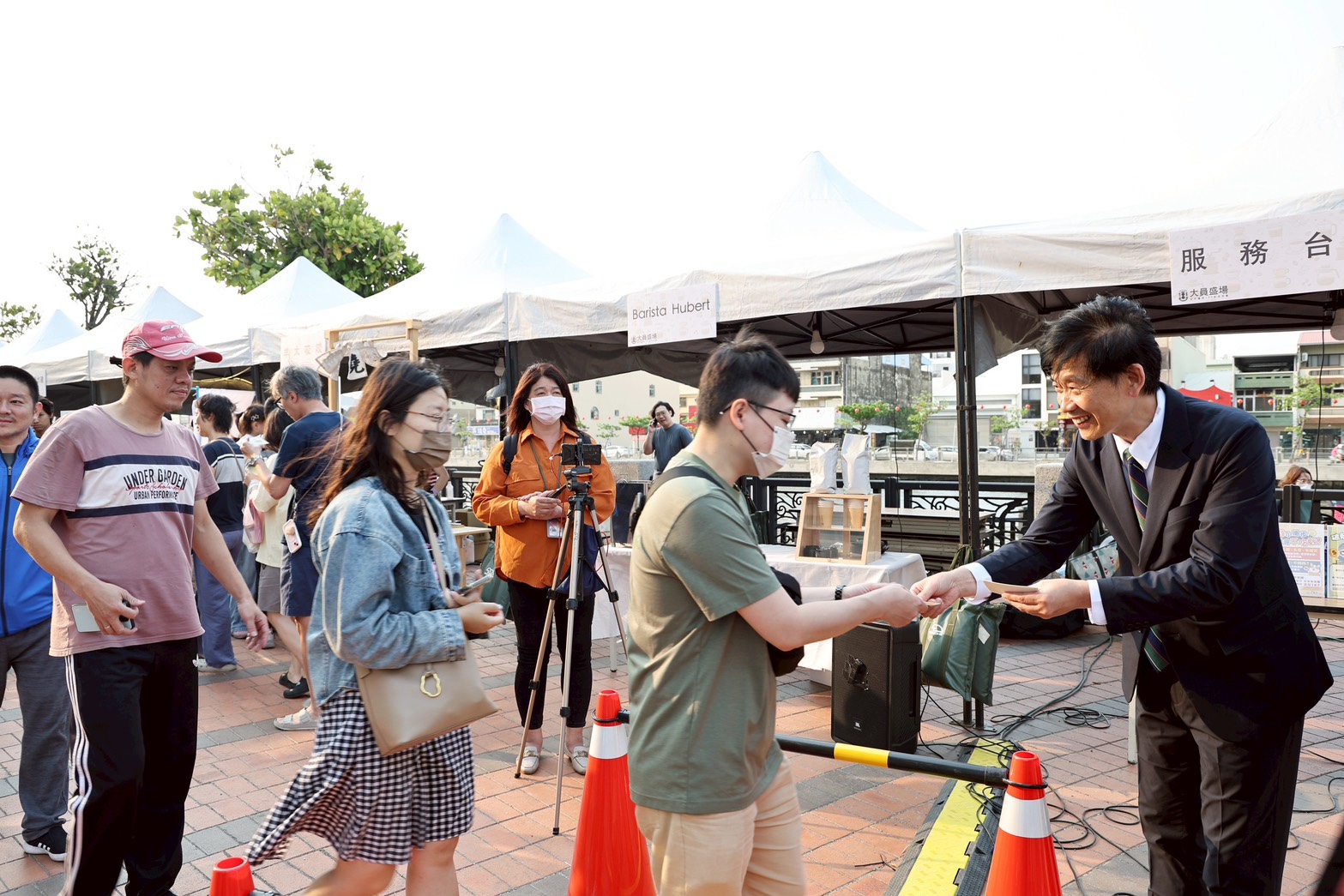 副市長葉澤山今(3)日代表市長黃偉哲出席在安平運河畔推出的「大員盛場」市集,現場發放限量「即享券」,吸引民眾踴躍排隊領取。