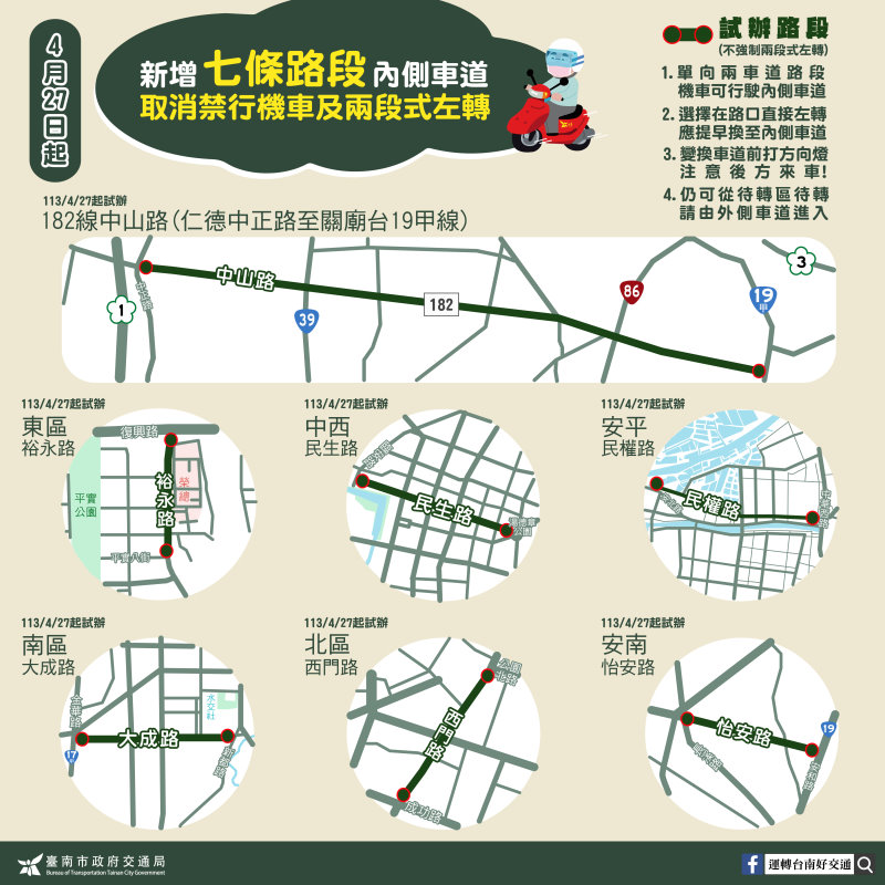 交通局表示,考量開放範圍所需工作量,預計自4月27日(六)起先針對民眾較常反映的7路段進行開放,包含東區裕永路(平實八街至永康復興路)、中西區民生路(湯德章圓環至臨安路)、安平區民權路(中華西路至安北路) 、南區大成路(新都路至金華路)、北區西門路(成功路至公園北路)、安南區怡安路(安和路至長溪路)及橫跨仁德區、歸仁區、關廟區的182線中山路(仁德中正路至關廟台19甲線),總計開放的路段達17.65公里及182處路口。