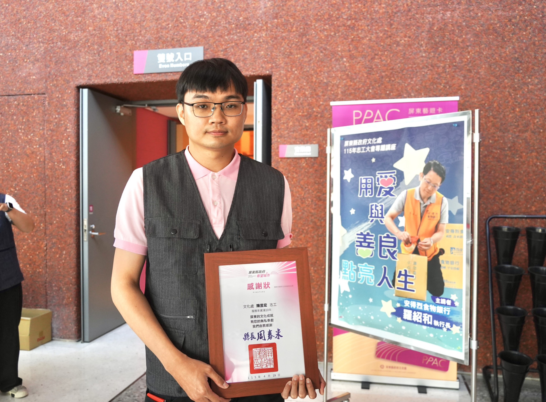 本次獲表揚的10年資深文化志工中,最年輕的33歲表演藝術志工大隊長陳昱宏分享,學生時期因熱愛表演藝術,長期為屏東演藝廳常客,進而投入志工服務,將興趣轉化為投入文化推廣的動力,擔任志工後,不僅能與民眾互動,也在志工夥伴彼此鼓勵與陪伴中,感受到滿滿的快樂與成就感。