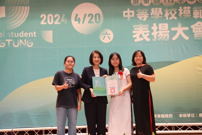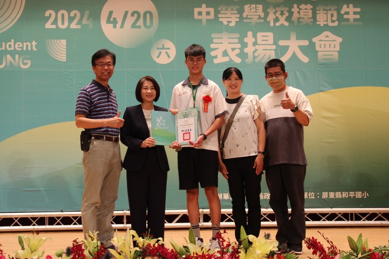 本次受表揚的學生中,竹田國中的陳廷碩,客家子弟,學習態度積極、做事負責、熱心助人,曾擔任班級風紀股長、學校升旗旗手、數學小老師、機關王社長等各項職務,表現均獲得師長肯定,此外,他曾代表學校參加現代舞比賽、客語合唱團比賽,均榮獲佳績,還是個優秀的波拉棒高手!