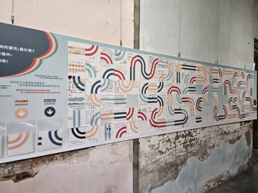 除了運河老照片與文物展示,在展場中的互動區域也別出心裁,讓民眾透過地圖疊圖發掘城市緊密的歷史紋理。而在展區中也留下一面牆,民眾可在貼紙上留下「一起愛護台南」、「希望台南運河乘載著台灣文化流傳給下一代」、「台南運河生日快樂」等文字,集結大眾對運河的祝福與願景。