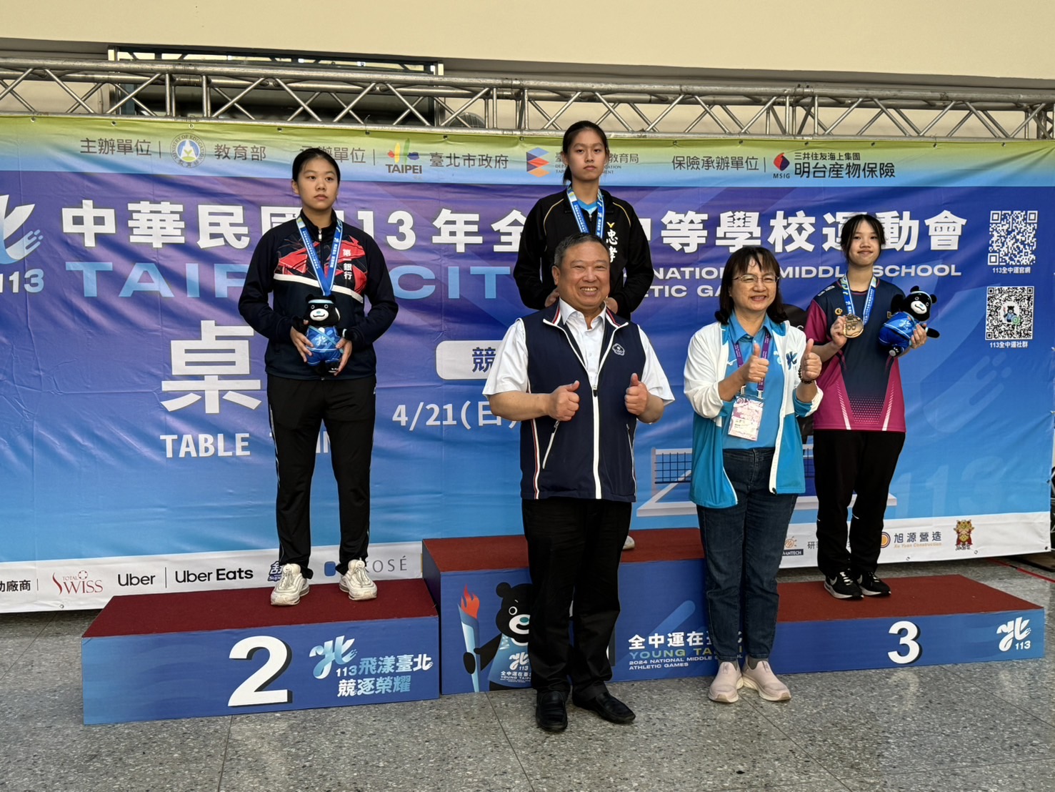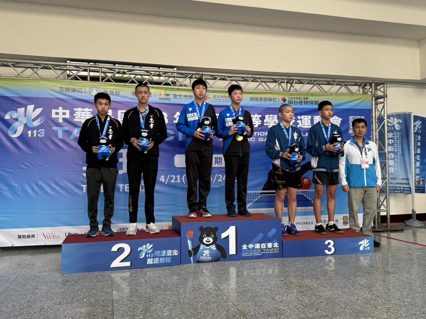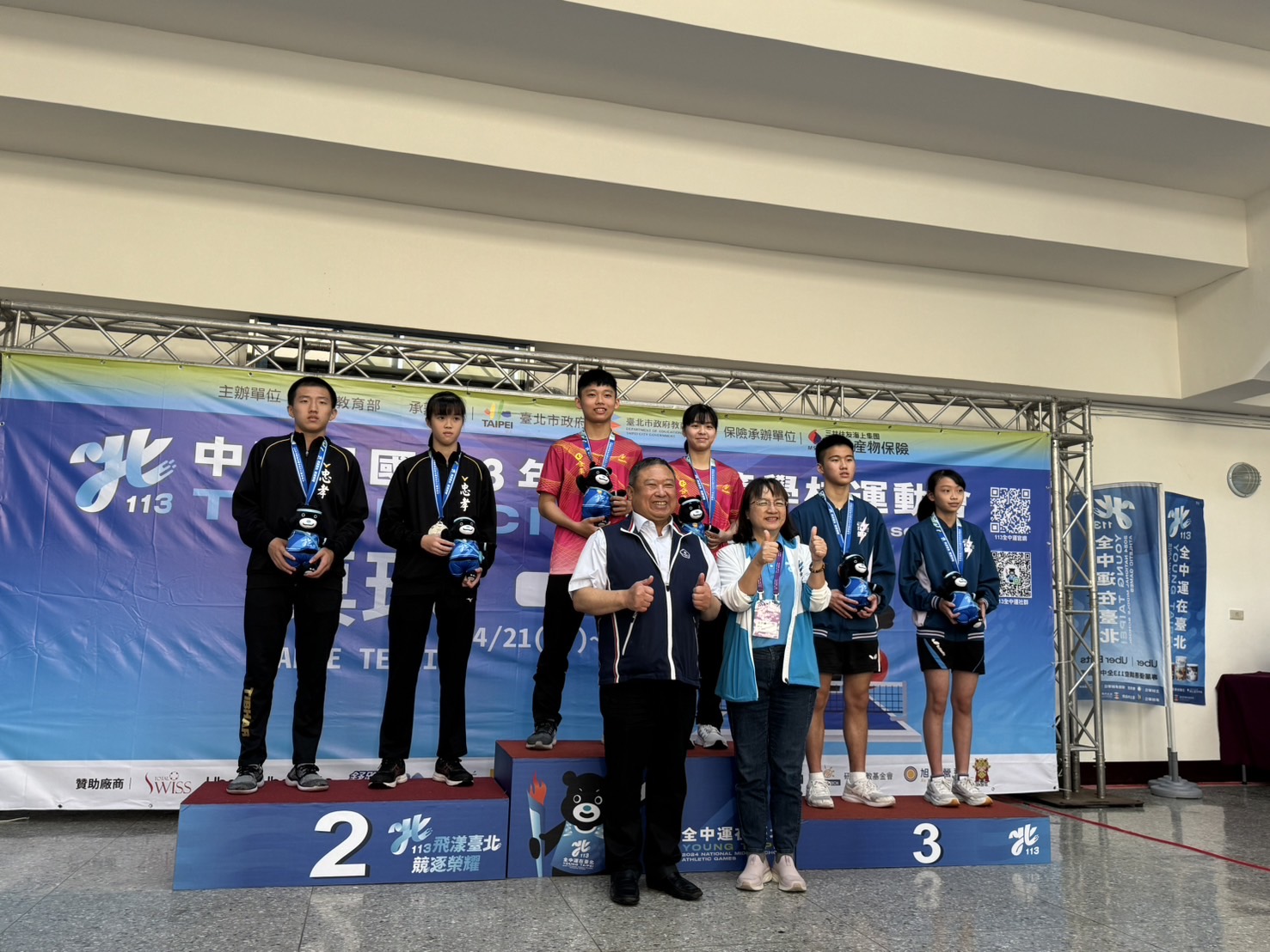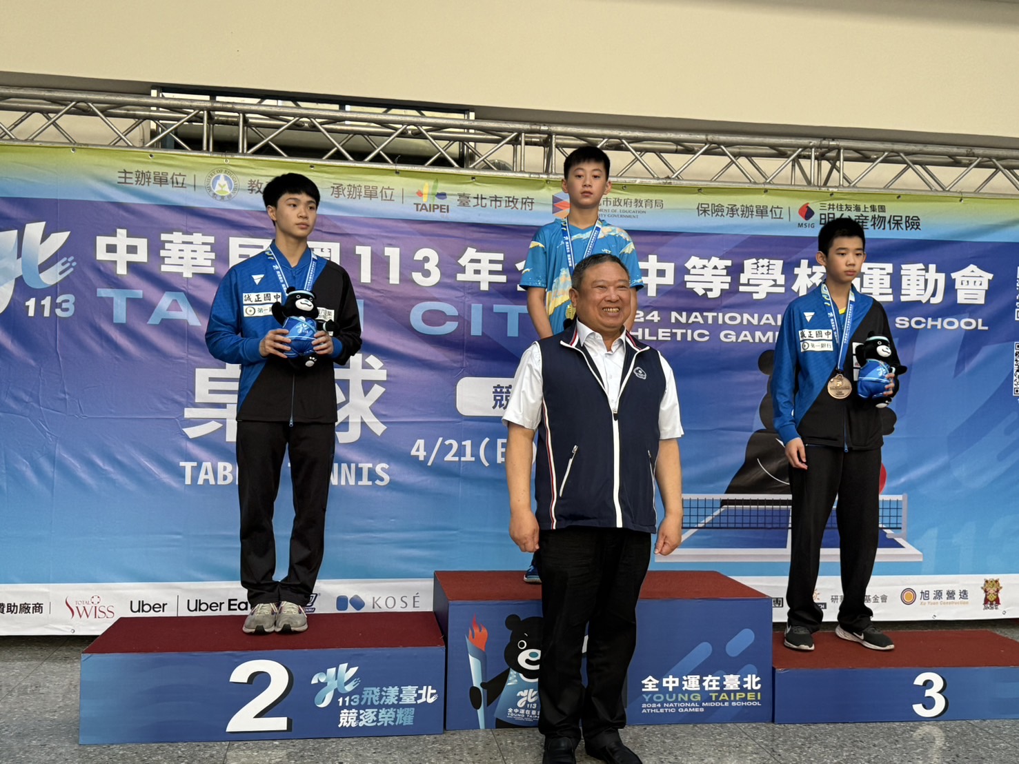 黃偉哲市長表示,忠孝國中國男組單打賽郭冠宏、國女組單打賽陳忞昕兩位同學在去年都無緣四強,這次捲土重來,雙雙挺進冠亞,並且以直落三擊敗對手,獲得113年國中組男、女單打賽冠軍!忠孝國中也在國中組桌球男女混合雙打賽、國男組雙打賽中獲得銀牌,國男組團體賽中獲得銅牌,總計2金2銀1銅,特別感謝教練、學校以及臺南市體育總會、臺南市桌球委員會的辛苦培訓。