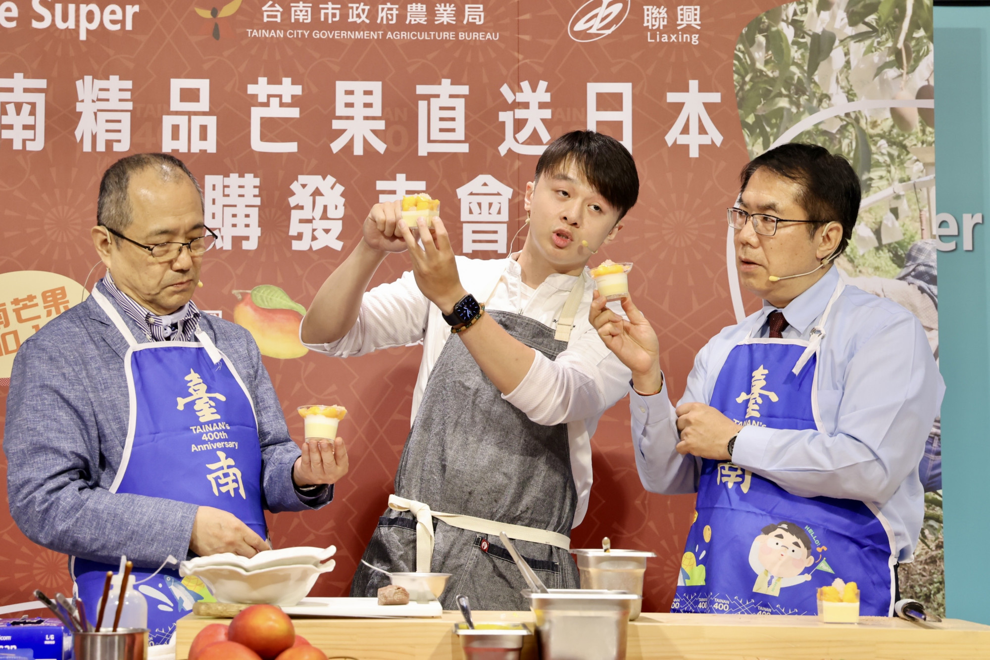 今日預購活動不僅展示台灣優質水果的魅力,更是一場台日友好的文化交流,現場由獲得多項廚藝獎得主游星淵主廚,帶著市長黃偉哲和微風超市總經理西川正史親自示範,分享如何用芒果簡單DIY輕食料理,現場更有限量試吃活動,讓大家品嚐,現場人潮絡繹不絕。