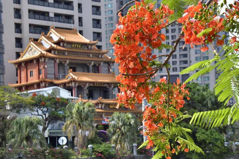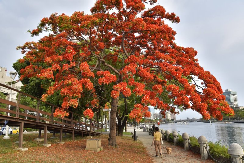 公園處補充,鳳凰木是蘇木亞科的多年生落葉大喬木,適合生長於全日照且溫暖的環境,是城市常選用的行道樹種類之一。夏季高雄的街頭、校園、綠地,金黃的阿勃勒及印度紫檀、浪漫的大花紫薇與艷麗華美的鳳凰木相互輝映,市容景觀精采紛呈,奼紫嫣紅的行道樹花毫不吝惜地裝飾著城市每個角落,歡迎市民朋友走出戶外感受花團錦簇的美好。