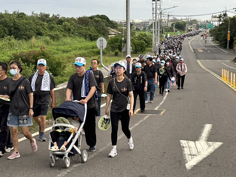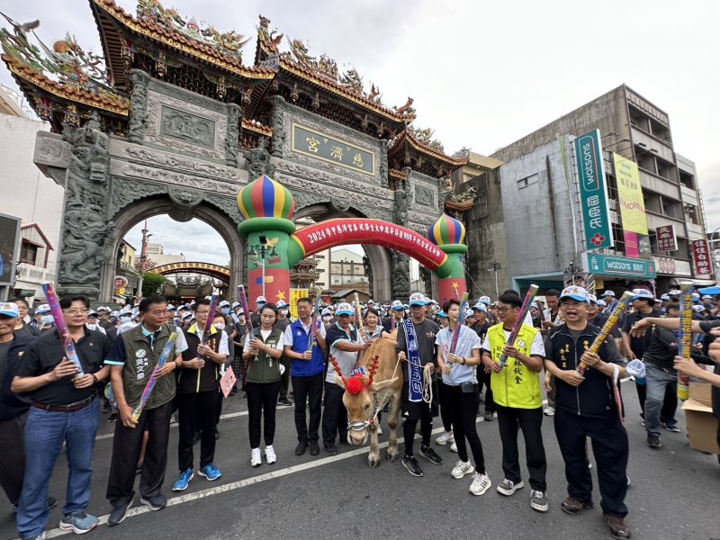 【記者田進山/台南報導】保生大帝台灣開基祖廟學甲慈濟宮,為提升全民運動風氣,迎接健康生活,2日舉辦「紀念保生大帝飛昇得道988周年全民健走活動」,董事長王文宗表示,今年的健走活動比以往踴躍將近2000人參加,上白礁專屬的報馬牛也在隊伍前跟大家一起健走,雖然下雨了,仍然無法阻擋虔誠信徒全程參與。