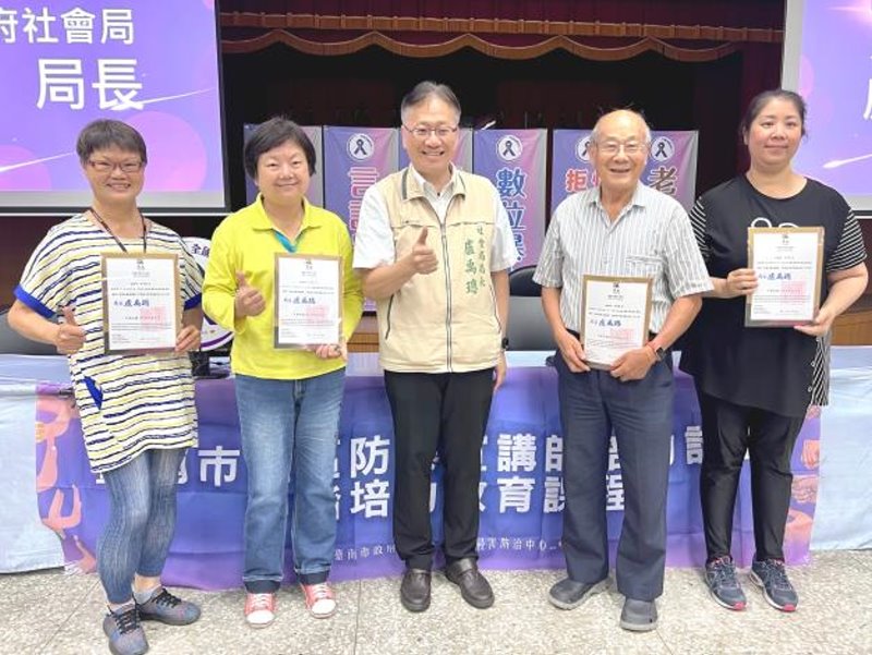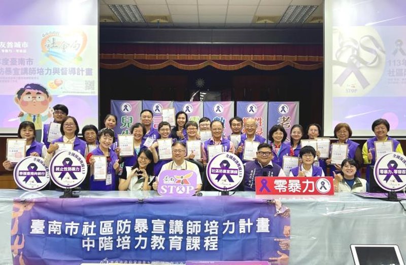 【記者陳岑博/台南報導】為落實黃偉哲市長打造安全城市的施政理念,臺南市社會局積極推展社區性別暴力初級預防工作,倡導普及化「防暴、減暴、無暴」的預防觀念,今(113)年度攜手文化創意部落工作室辦理兩梯次課程。為均衡區域,讓有志之士們就近參訓,特在市府警察局善化分局辦理初階及中階培力課程,第一梯次計有38名社區人士參加;社會局盧禹璁局長於昨(2)日親自到場為學員加油打氣,並頒發完訓證明及本市社區防暴宣講師背心予20位完訓學員,肯定其全勤參訓、投身防暴宣講工作。