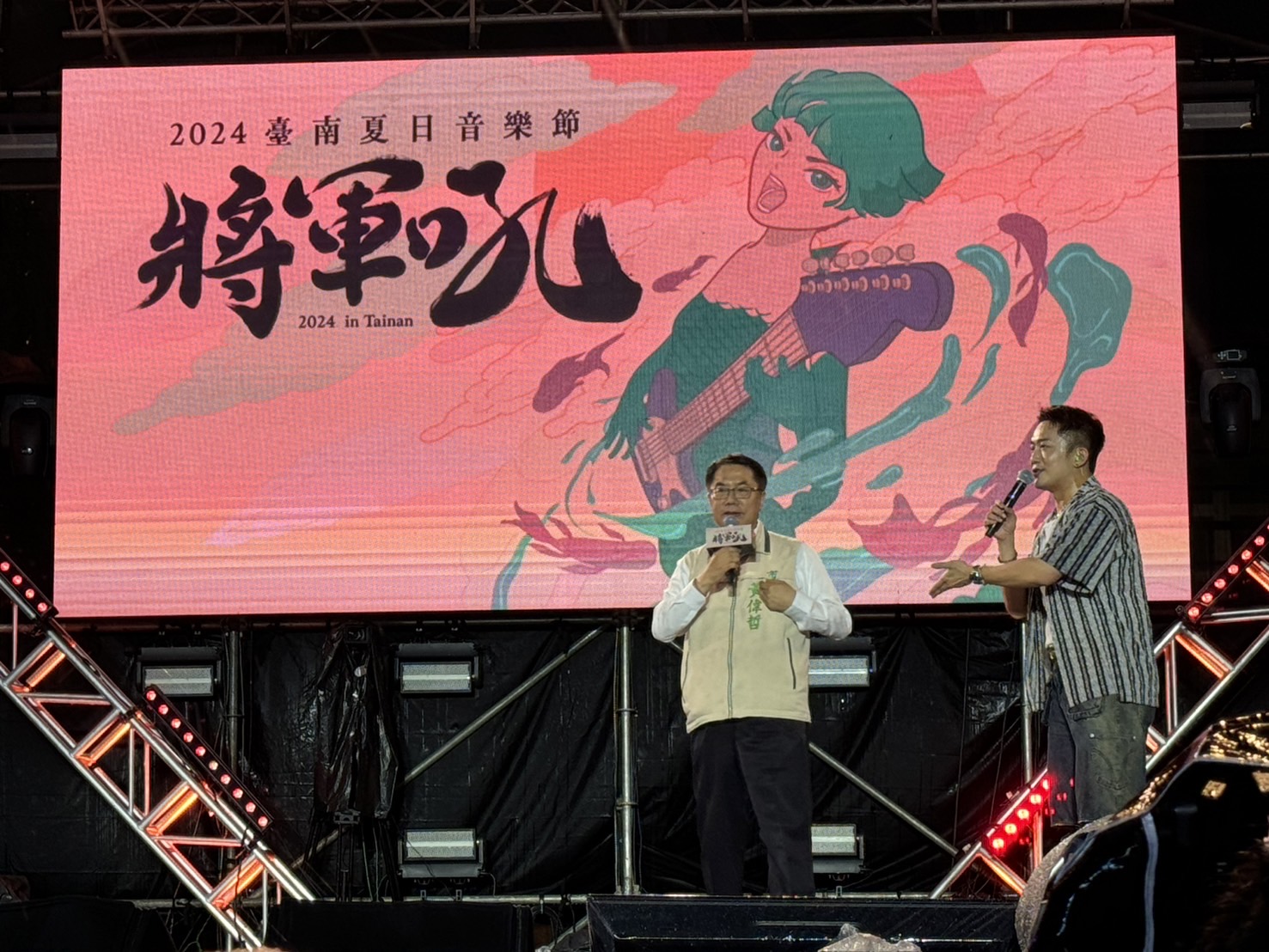 2024臺南將軍吼夏日音樂節今(21)日進入第二天,繼昨天讓將軍漁港越夜越嗨,臺南市長黃偉哲今晚特別上台演唱「愛我別走」,帶熱全場氣氛,他也表示,若對今年底跨年晚會的卡司有想法,皆可到市長的臉書或IG留言,也許就能許願成功。精彩的將軍吼活動連續兩天累計吸引逾9萬人次參與,齊聚濱海High翻將軍漁港,熱鬧滾滾。