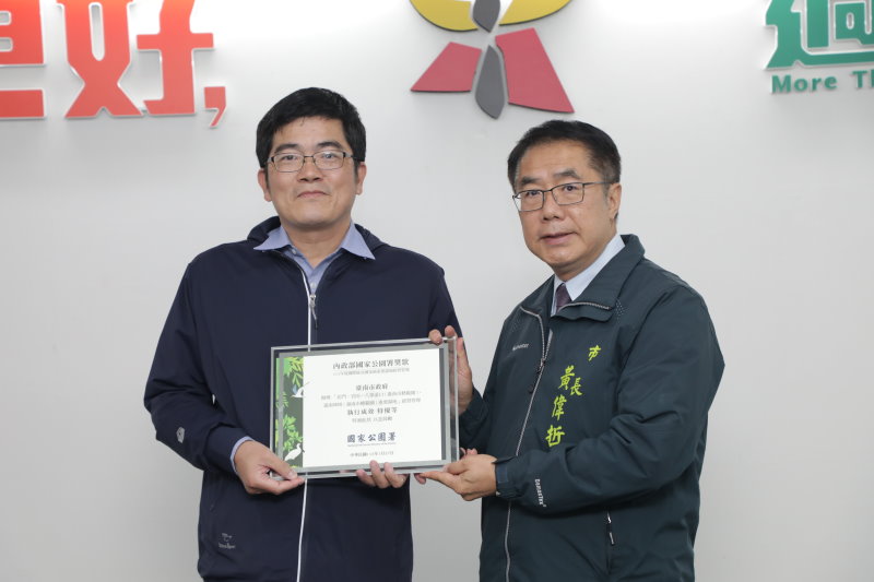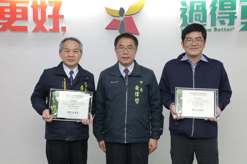 台南市濕地保育有成獲內政部評鑑優等獎!農業局長李建裕及保育科長朱健明呈獎狀給市長黃偉哲。(記者田進山攝)