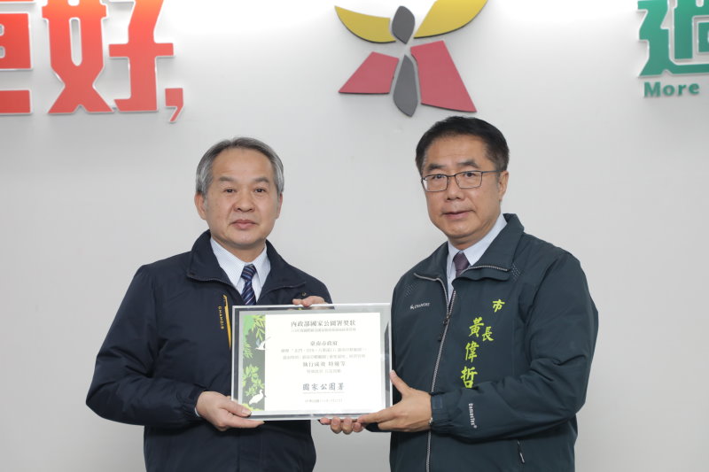 台南市濕地保育有成獲內政部評鑑優等獎!保育科長朱健明呈獎狀給市長黃偉哲。(記者田進山攝)