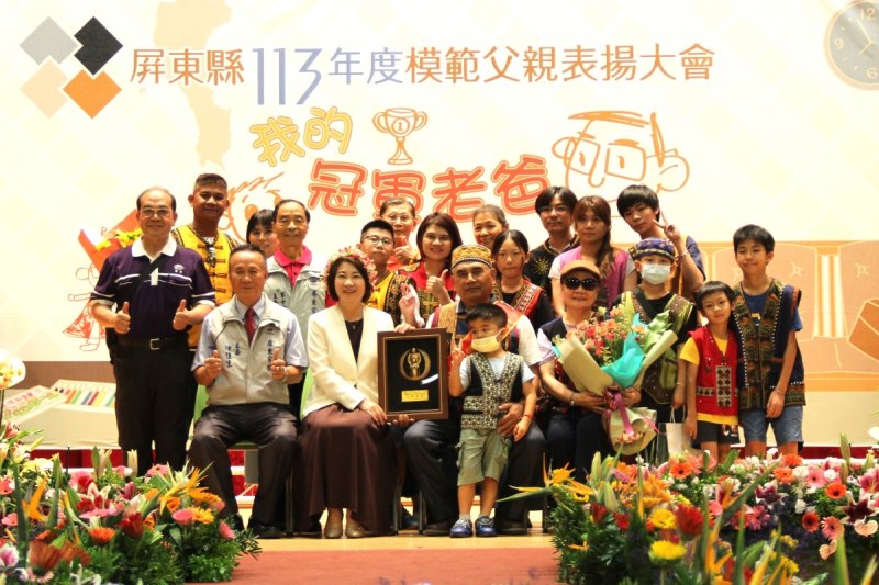 【記者黃石泉/屏東縣報導】父親節將至,屏東縣長周春米今(28)日在縣府大禮堂表揚46位模範父親,感謝父親堅定無私的付出。其中義消簡榮曾參與南投921大地震、枋山南迴鐵路搜救、北大武山難救災等重大事件,兒子受其影響,也加入義消的行列;巴慶祥與妻子加入寄養服務已19年,總計照顧過18名寄養兒少,更將一名寄養兒童收養,令人敬佩。