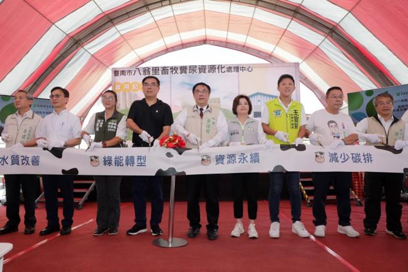 【記者陳岑博/台南報導】畜牧排泄物也能變黃金!臺南柳營八翁里是全國最大酪農區,在產官學研公私協力下,誕生全國首座酪農綠能循環中心,全臺最大的畜牧糞尿集中處理廠-「臺南市八翁里畜牧糞尿資源化處理中心」今(1)日正式啟用,臺南市長黃偉哲與環境部長彭啓明共同主持啟用典禮,立委賴惠員及市議員沈家鳳、蔡育輝、王宣貿與當地畜牧業者、產官學界專家代表到場共襄盛舉,未來除可改善酪農區畜牧廢水與異味問題,更能有效提升鄰近急水溪水質,為地方創造多贏,更是全臺畜牧污染轉廢為能標竿。